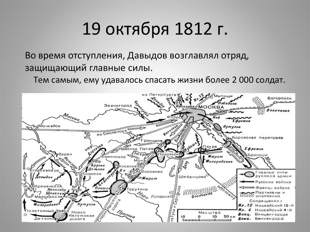 19 октября 1812 г.Во время отступления, Давыдов возглавлял отряд,