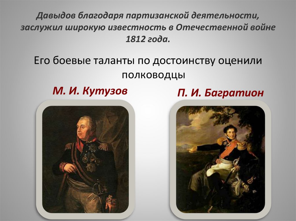 Давыдов благодаря партизанской деятельности,заслужил широкую известность в Отечественной войне