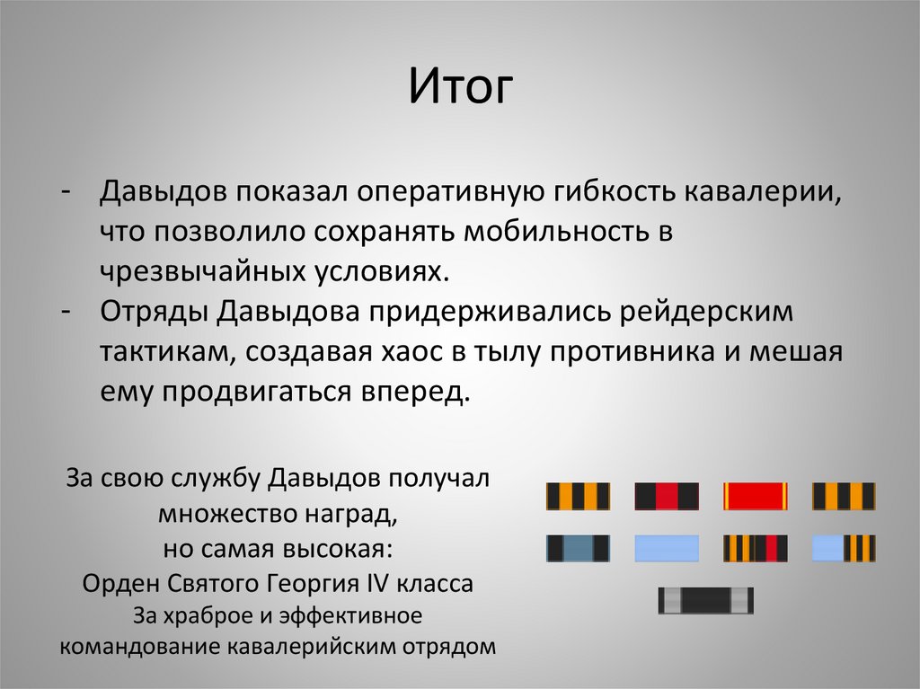 Итог- Давыдов показал оперативную гибкость кавалерии,