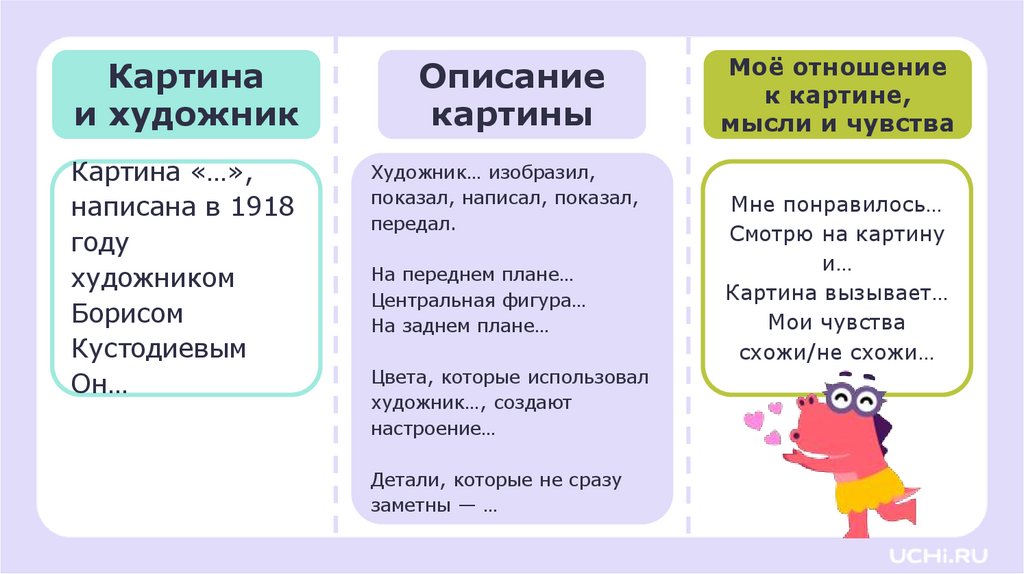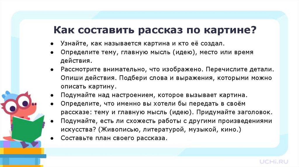 Как составить рассказ по картине?Узнайте, как называется картина и кто её создал.