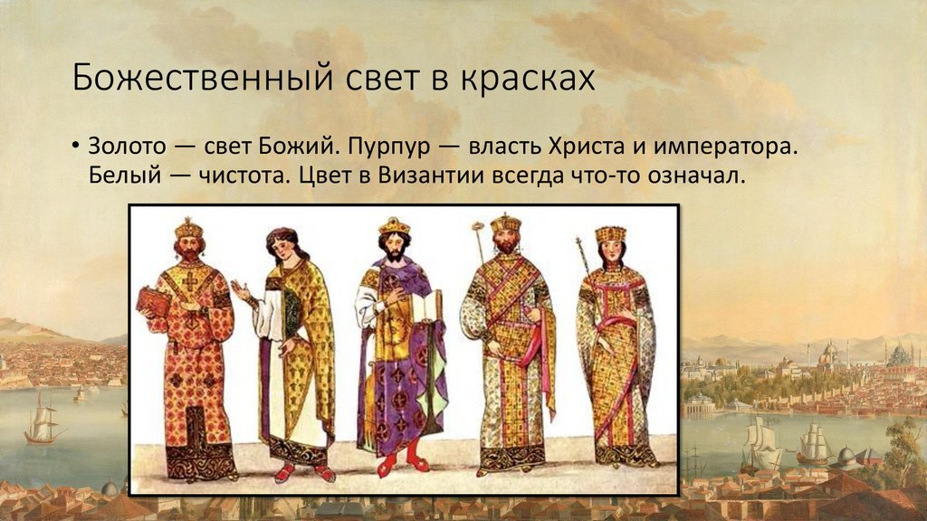 Божественный свет в красках• Золото — свет Божий. Пурпур — власть Христа и императора.