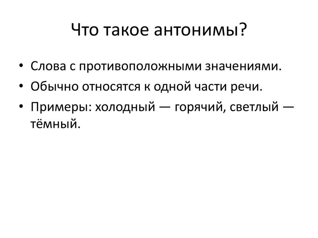 • Примеры: холодный — горячий, светлый —