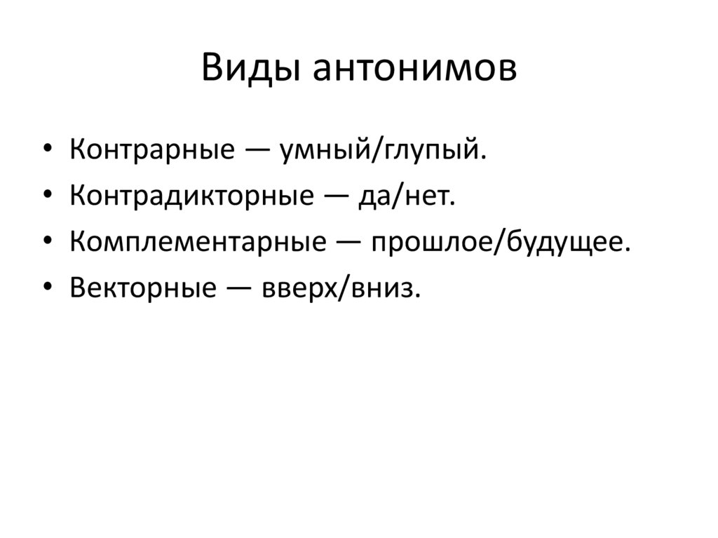 Виды антонимов• Контрарные — умный/глупый.