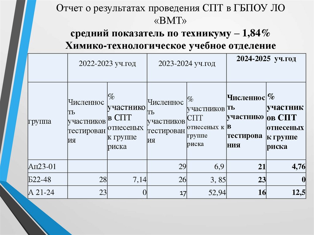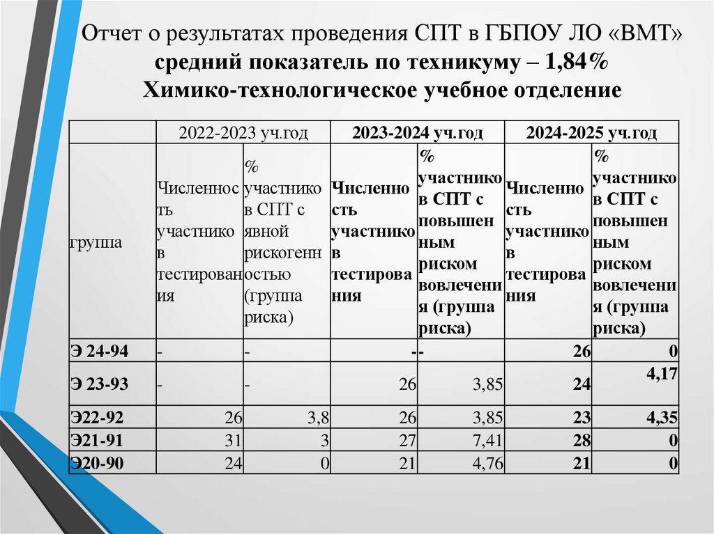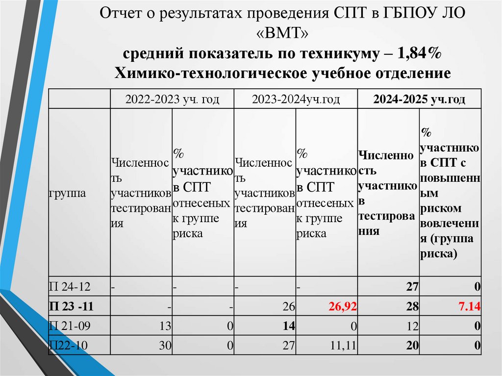 26. Отчет о результатах проведения СПТ в ГБПОУ ЛО «ВМТ» средний показатель по техникуму – 1,84%