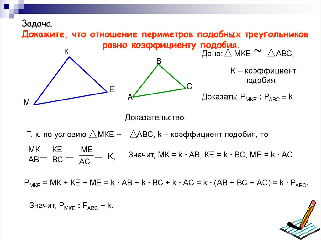 Значит, МК = k ∙ АВ, КЕ = k ∙ ВС, МЕ = k ∙ АС.