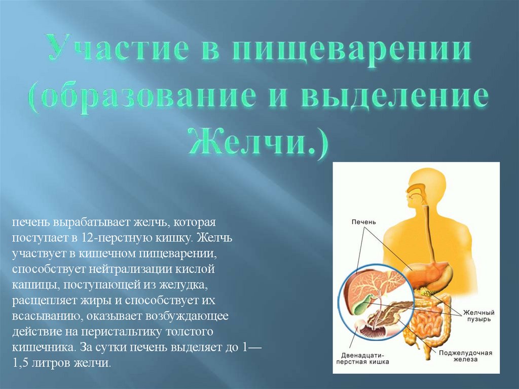 печень вырабатывает желчь, котораяпоступает в 12-перстную кишку. Желчь