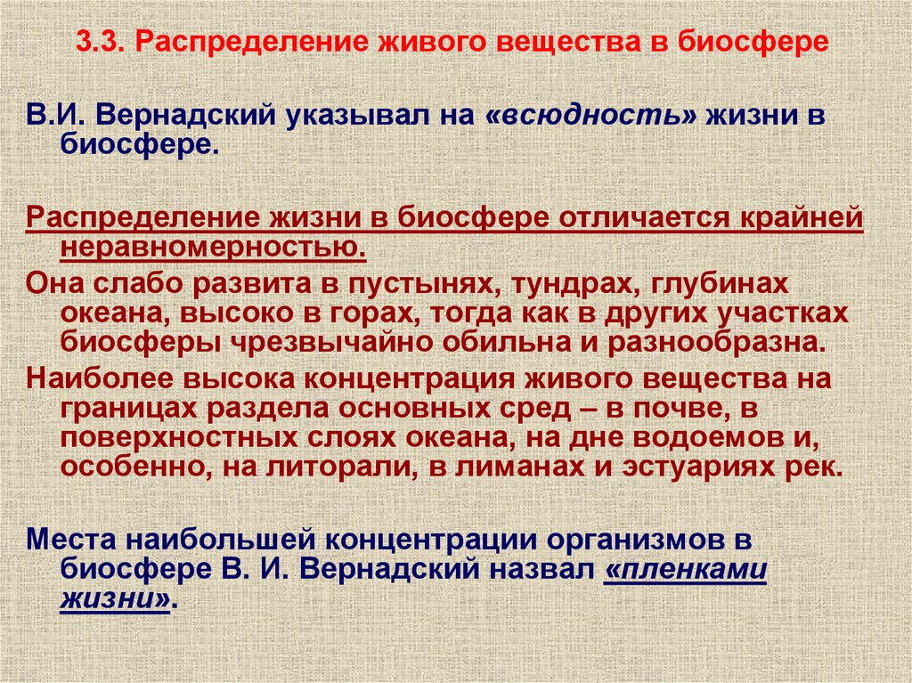 3.3. Распределение живого вещества в биосфереВ.И. Вернадский указывал на «всюдность» жизни в