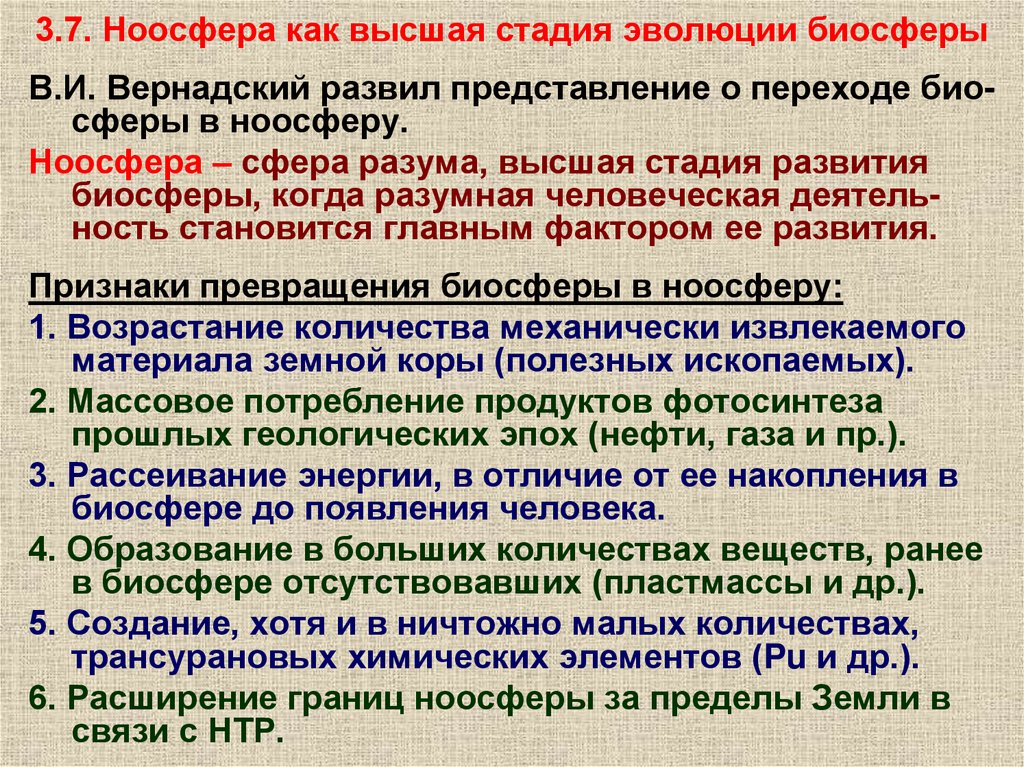 3.7. Ноосфера как высшая стадия эволюции биосферыВ.И. Вернадский развил представление о переходе биосферы в ноосферу.