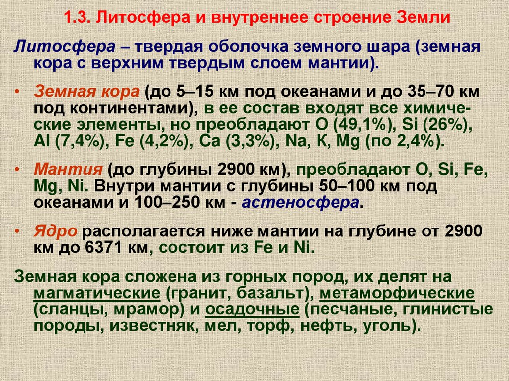 1.3. Литосфера и внутреннее строение ЗемлиЛитосфера – твердая оболочка земного шара (земная