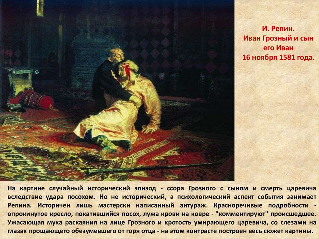 Репина. Историчен лишь мастерски написанный антураж. Красноречивые подробности опрокинутое кресло, покатившийся посох, лужа крови на ковре - "комментируют" происшедшее.