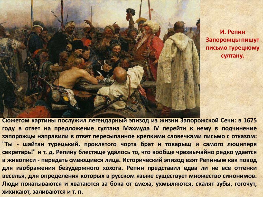 в живописи - передать смеющиеся лица. Исторический эпизод взят Репиным как повод