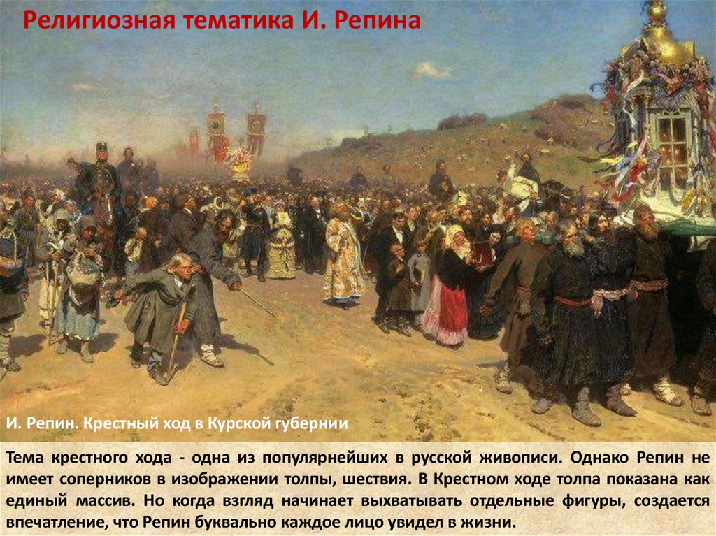 Тема крестного хода - одна из популярнейших в русской живописи. Однако Репин не
