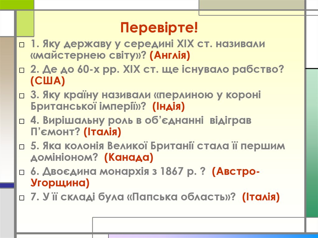Перевірте!□ 1. Яку державу у середині ХІХ ст. називали