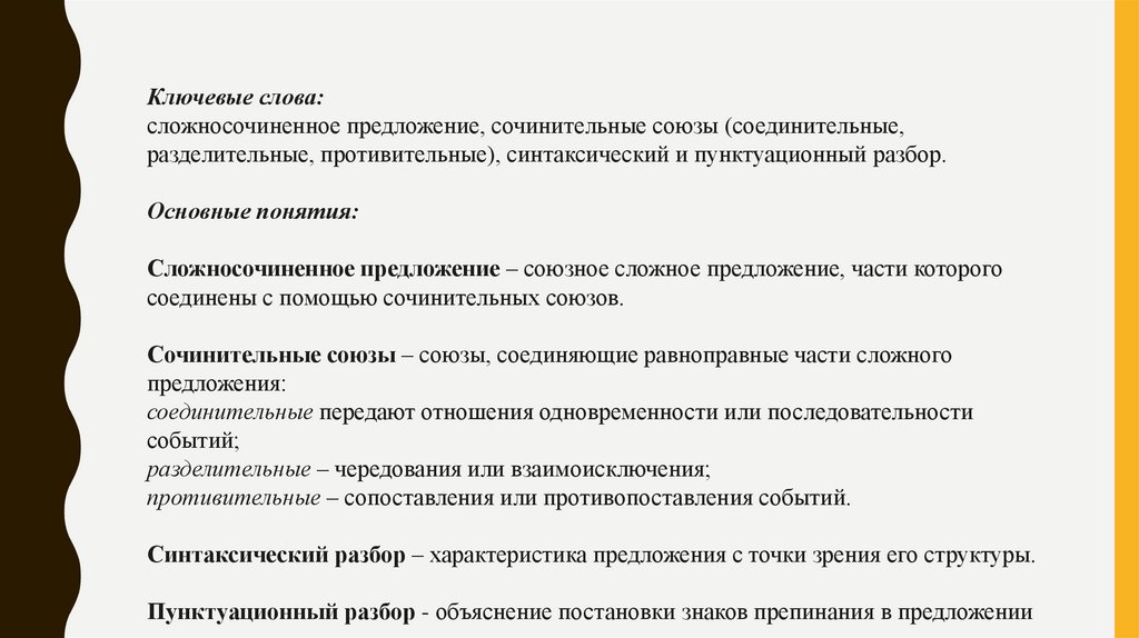 Ключевые слова:сложносочиненное предложение, сочинительные союзы (соединительные,