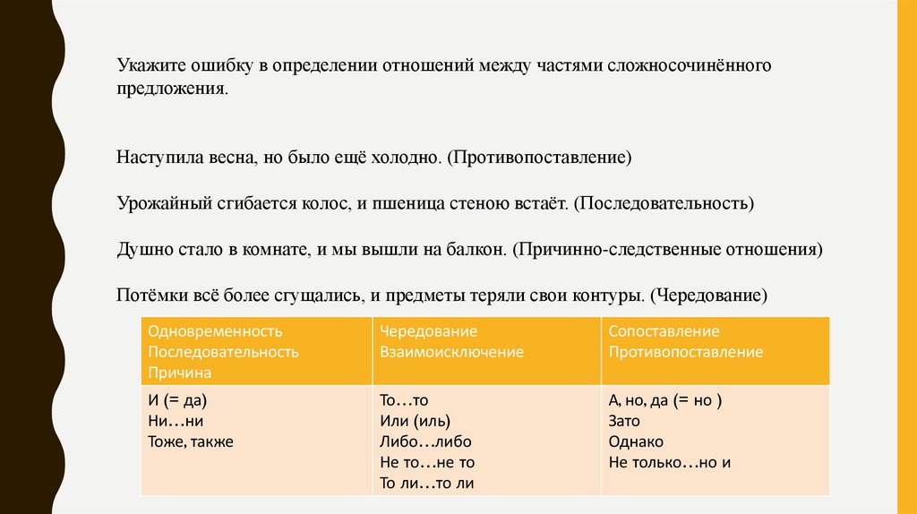 Укажите ошибку в определении отношений между частями сложносочинённогопредложения.