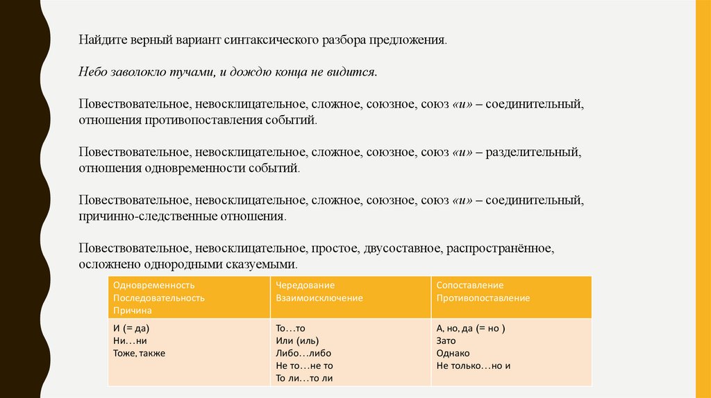 Найдите верный вариант синтаксического разбора предложения.Небо заволокло тучами, и дождю конца не видится.
