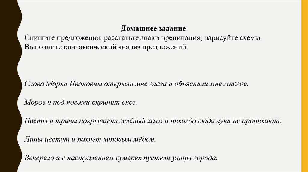 Домашнее заданиеСпишите предложения, расставьте знаки препинания, нарисуйте схемы.