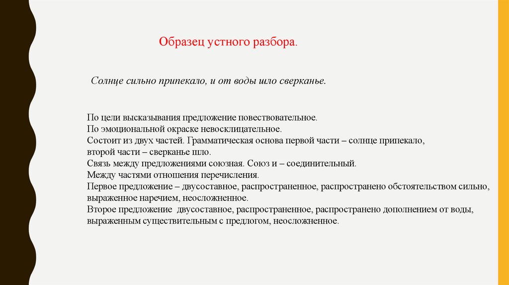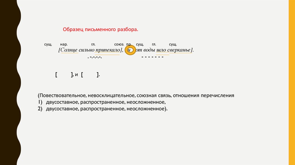 Образец устного разбора.Солнце сильно припекало, и от воды шло сверканье.