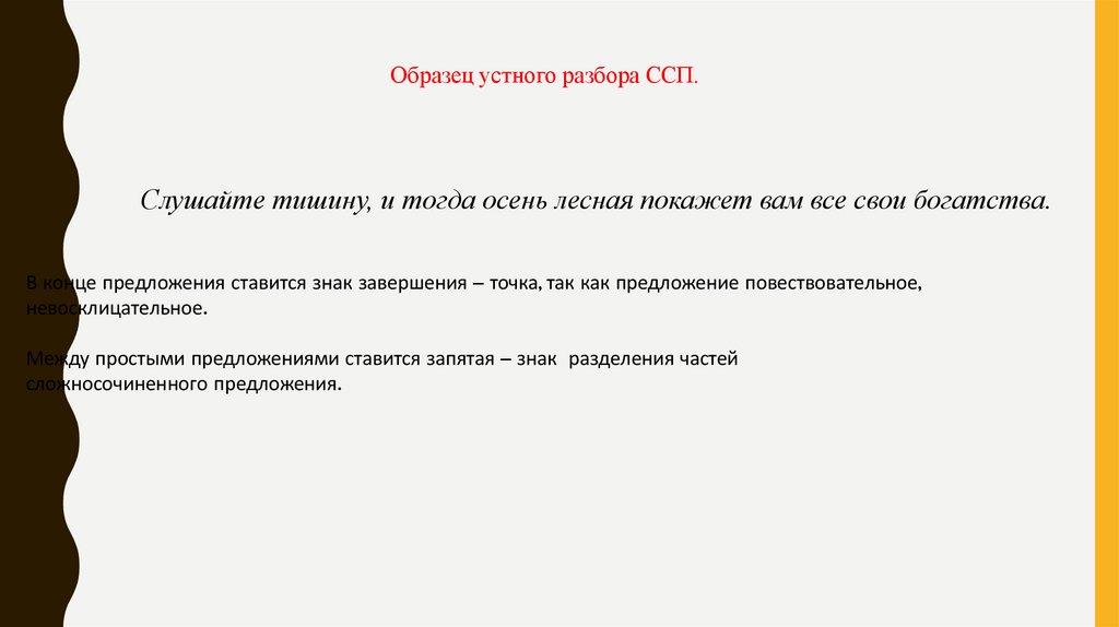 Образец устного разбора ССП.Слушайте тишину, и тогда осень лесная покажет вам все свои богатства.