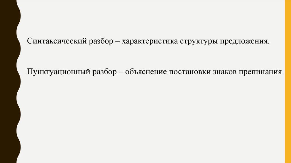 Синтаксический разбор – характеристика структуры предложения.Пунктуационный разбор – объяснение постановки знаков препинания.