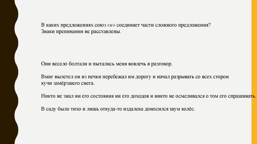 Повествовательное, невосклицательное, сложное, союзное, союз «и» – соединительный,