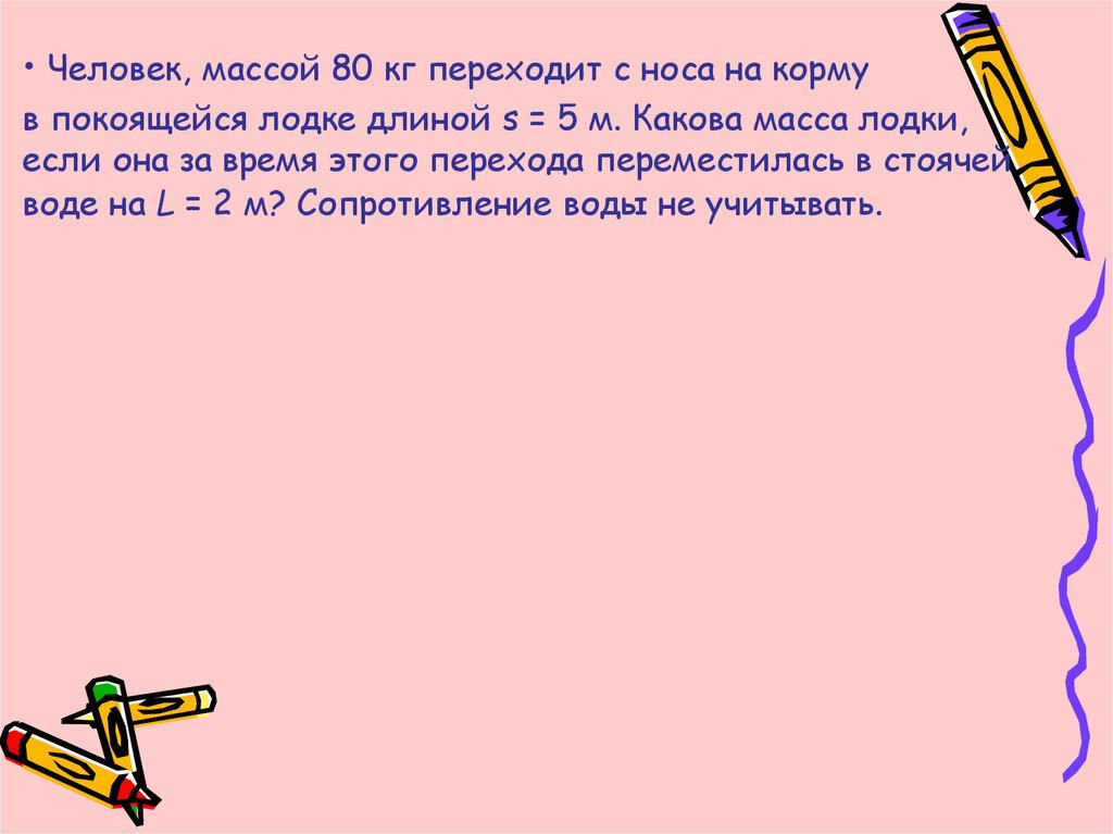 • Человек, массой 80 кг переходит с носа на кормув покоящейся лодке длиной s = 5 м. Какова масса лодки,