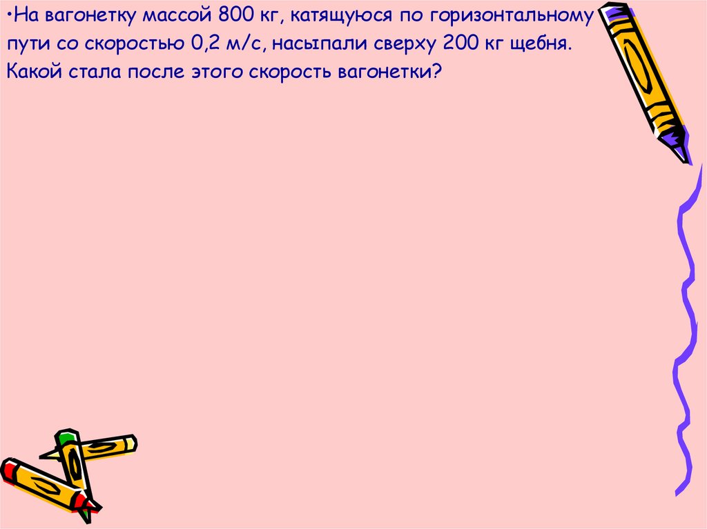 •На вагонетку массой 800 кг, катящуюся по горизонтальномупути со скоростью 0,2 м/с, насыпали сверху 200 кг щебня.