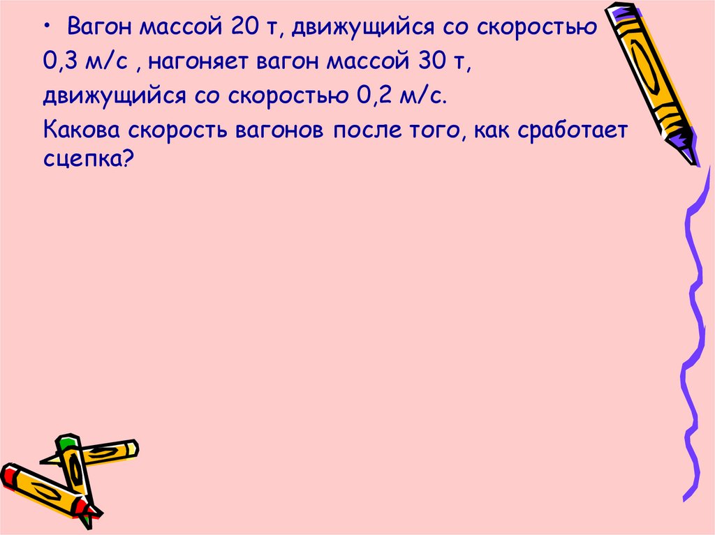 • Вагон массой 20 т, движущийся со скоростью0,3 м/с , нагоняет вагон массой 30 т,