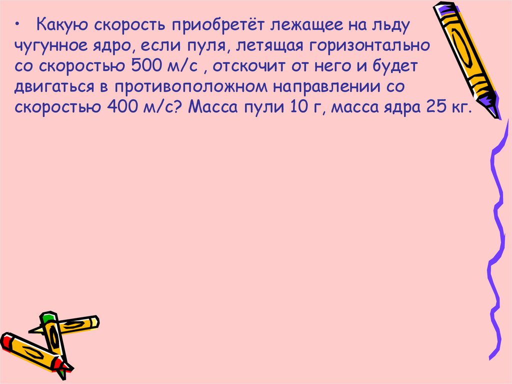 • Какую скорость приобретёт лежащее на льдучугунное ядро, если пуля, летящая горизонтально
