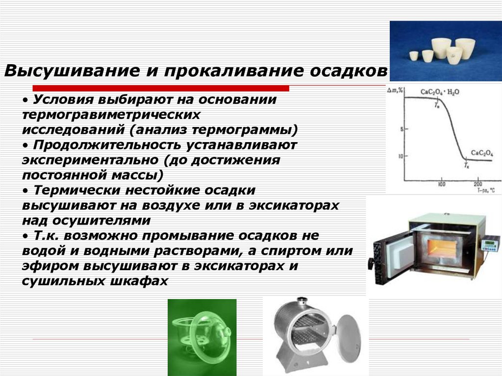 Высушивание и прокаливание осадков• Условия выбирают на основании