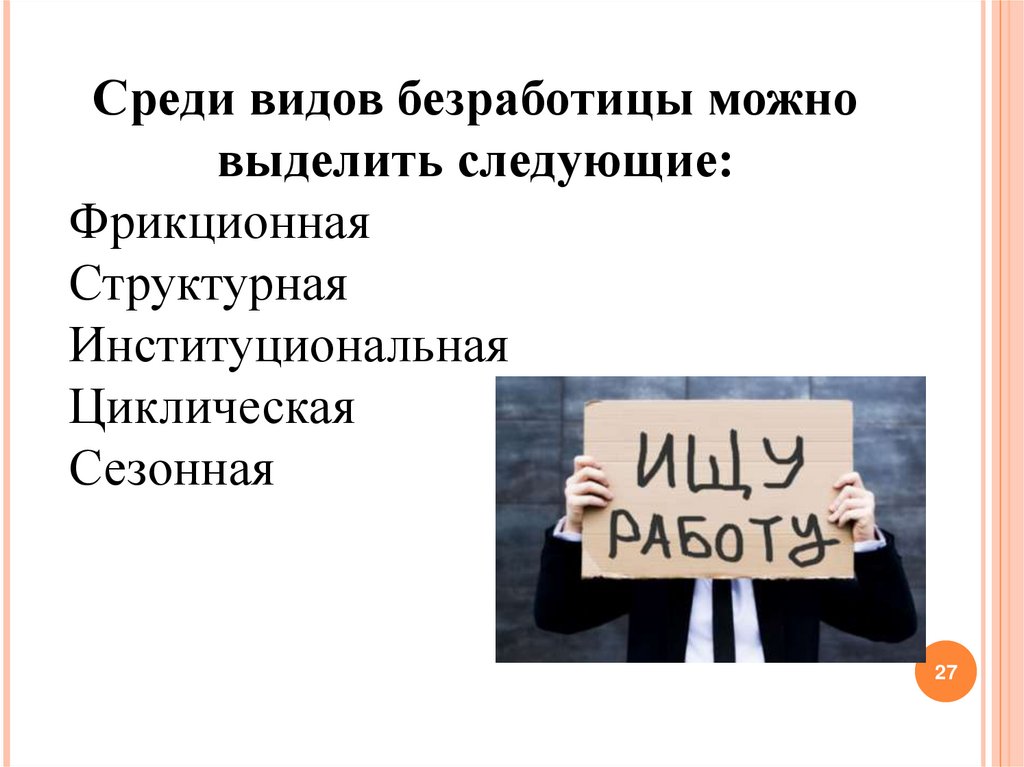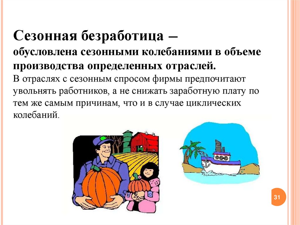 Сезонная безработица —обусловлена сезонными колебаниями в объеме