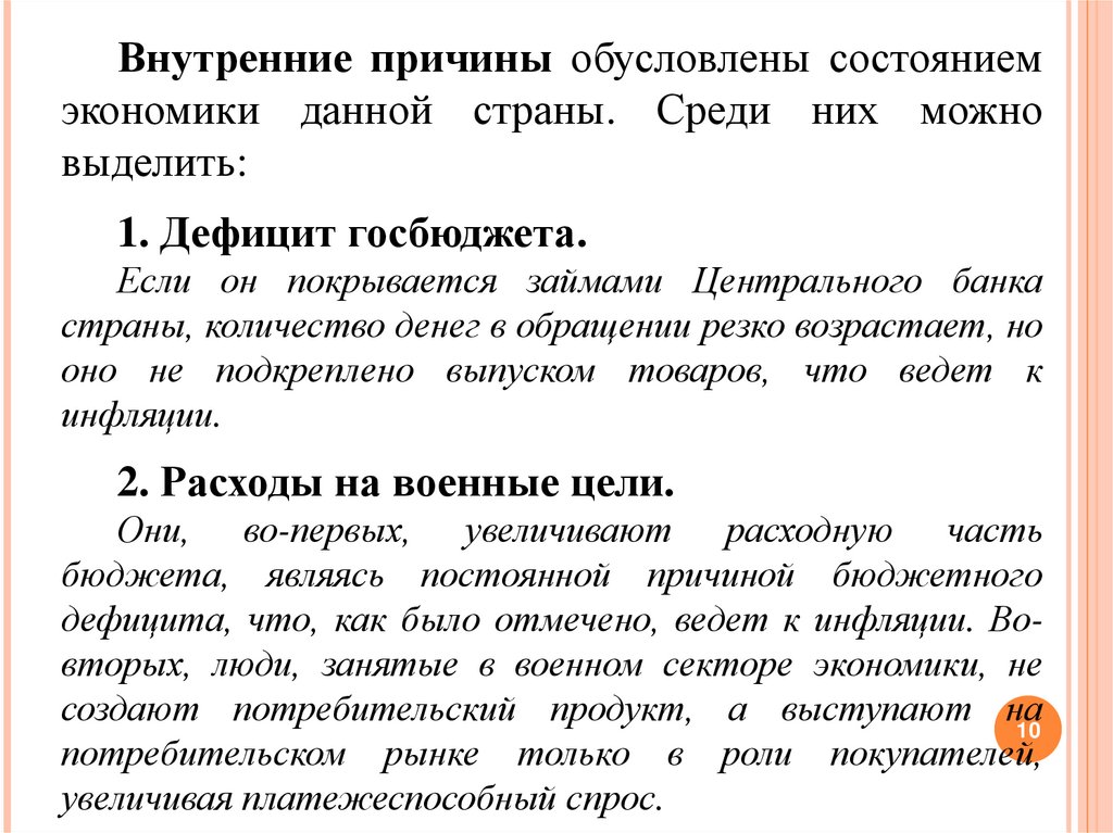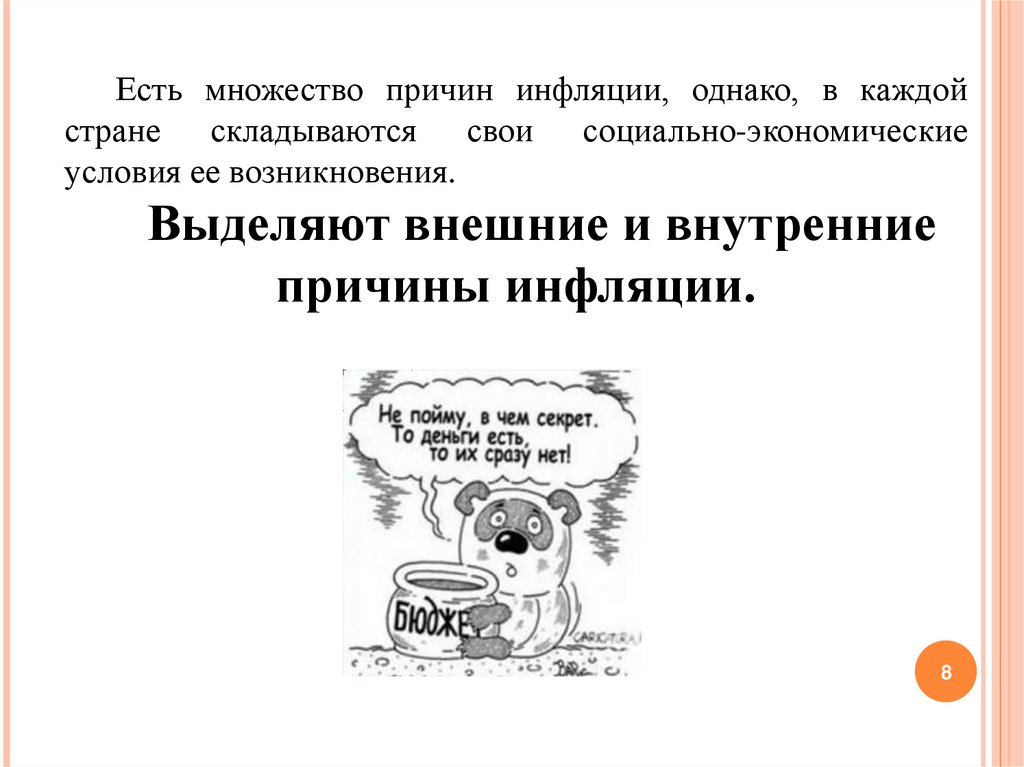 Есть множество причин инфляции, однако, в каждойстране складываются свои социально-экономические