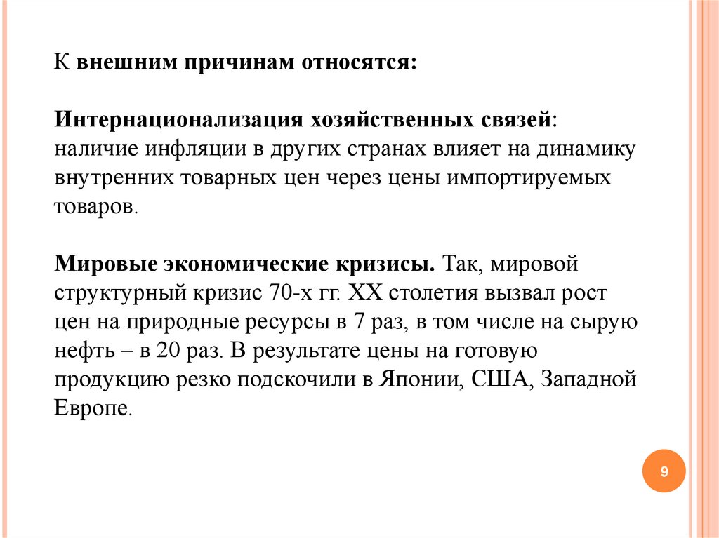 К внешним причинам относятся:Интернационализация хозяйственных связей: