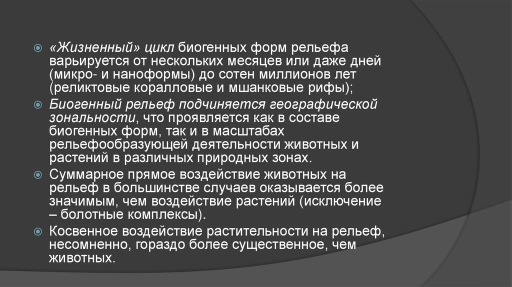 «Жизненный» цикл биогенных форм рельефаварьируется от нескольких месяцев или даже дней