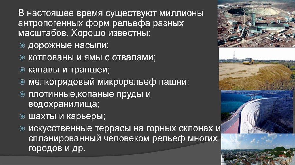 С появлением человека разумного возник и новый факторрельефообразования – антропогенный. Особенно мощным