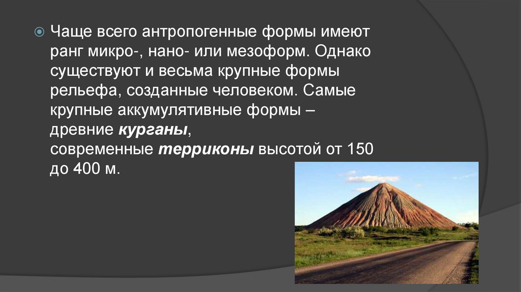 Чаще всего антропогенные формы имеютранг микро-, нано- или мезоформ. Однако
