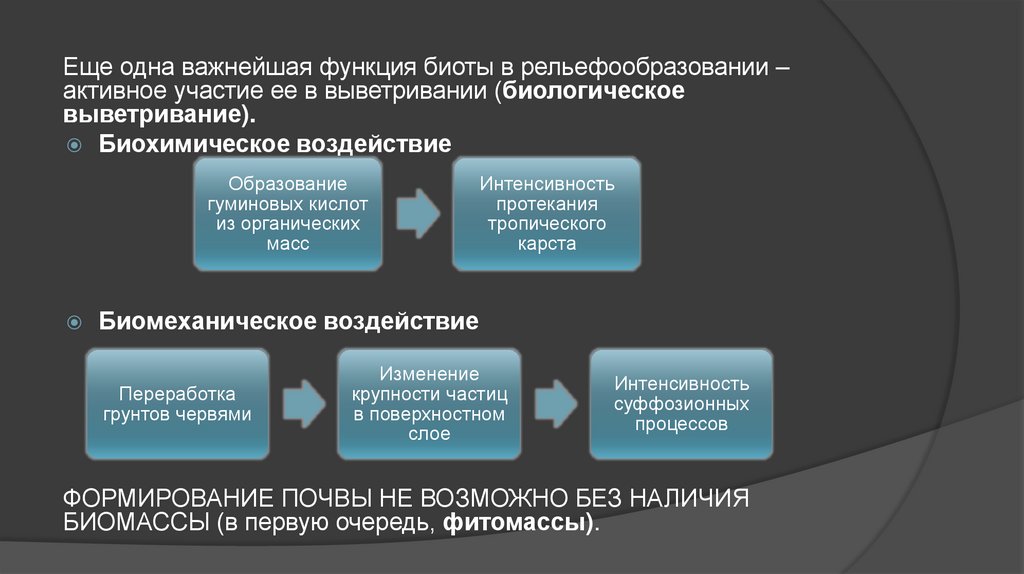 Еще одна важнейшая функция биоты в рельефообразовании –активное участие ее в выветривании (биологическое