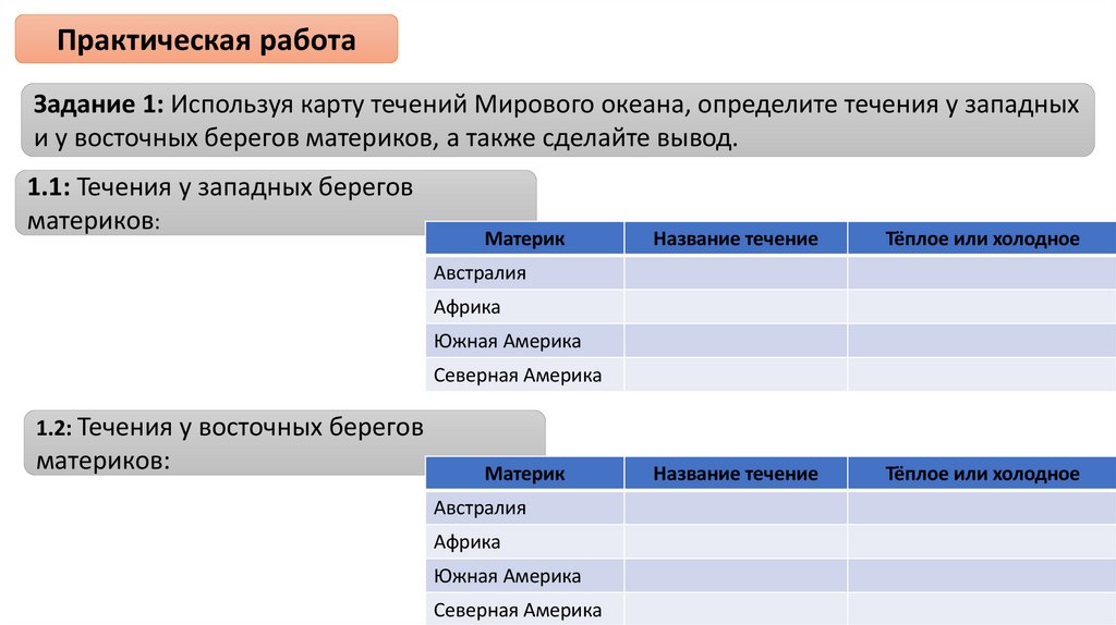 Практическая работаЗадание 1: Используя карту течений Мирового океана, определите течения у западных