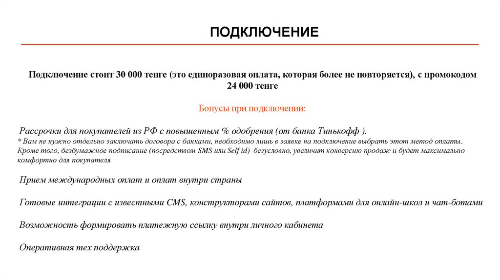 ПОДКЛЮЧЕНИЕПодключение стоит 30 000 тенге (это единоразовая оплата, которая более не повторяется), с промокодом