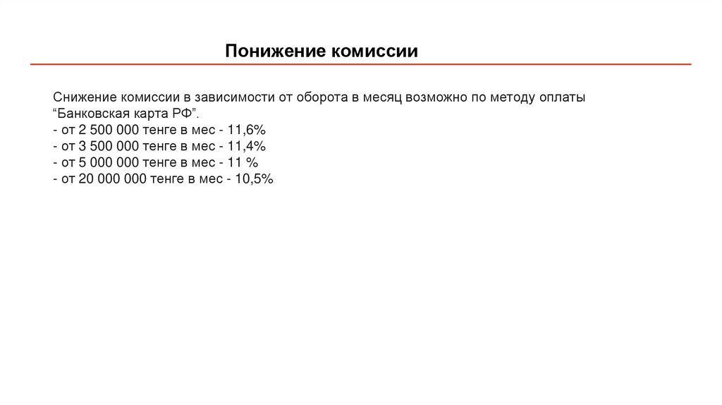 Понижение комиссииСнижение комиссии в зависимости от оборота в месяц возможно по методу оплаты