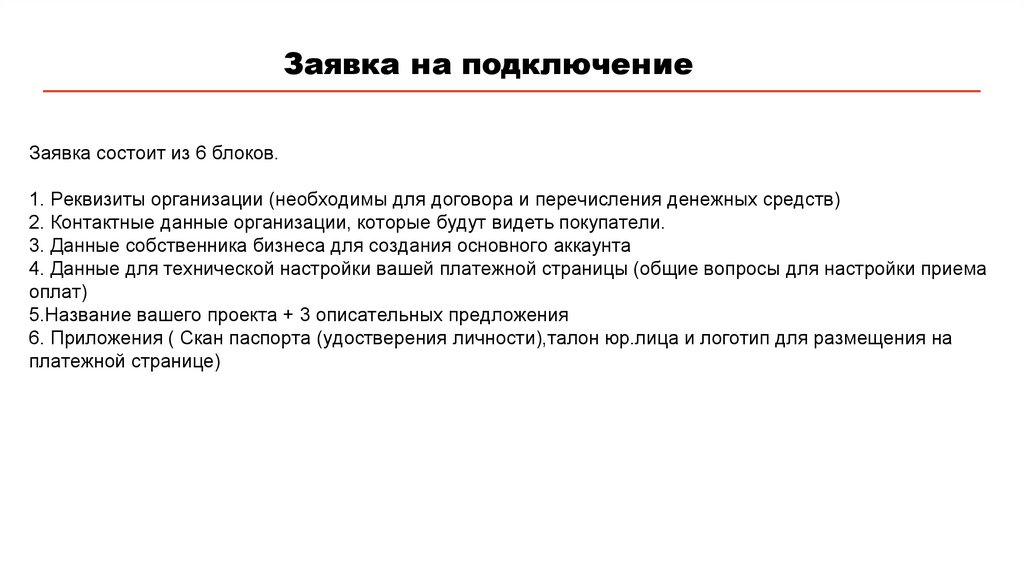 Заявка на подключениеЗаявка состоит из 6 блоков.