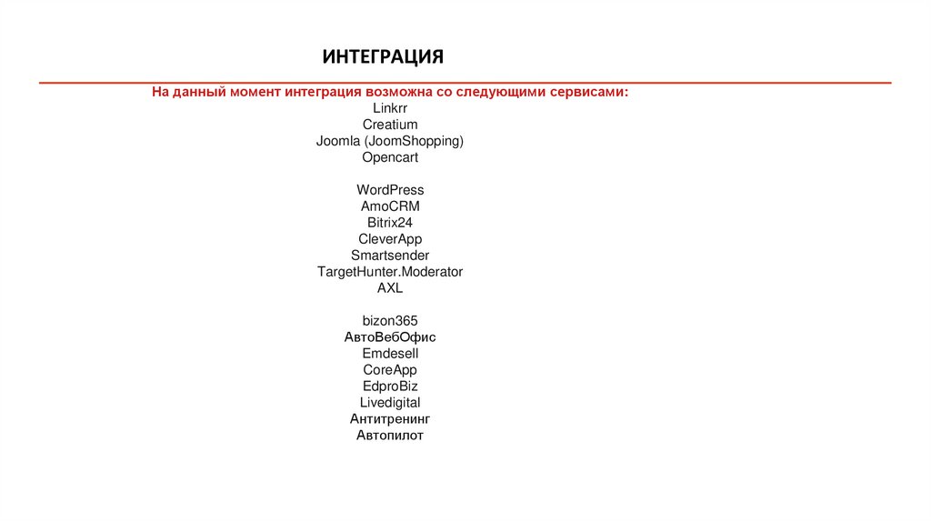 ИНТЕГРАЦИЯНа данный момент интеграция возможна со следующими сервисами: