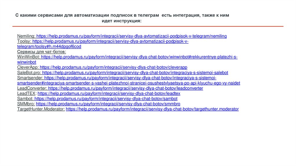 С какими сервисами для автоматизации подписок в телеграм есть интеграция, также к нимидет инструкция: