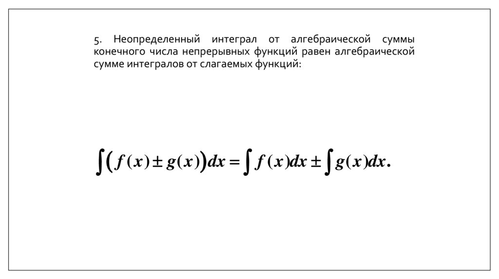 5. Неопределенный интеграл от алгебраической суммыконечного числа непрерывных функций равен алгебраической