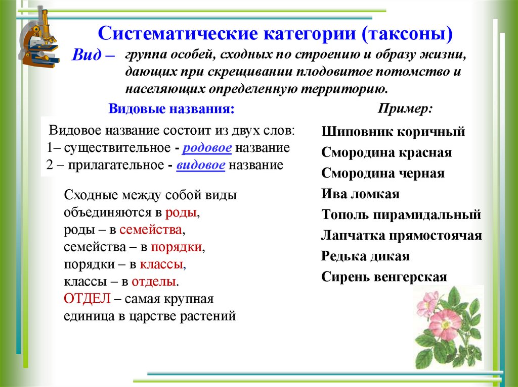 Систематические категории (таксоны)Вид – группа особей, сходных по строению и образу жизни,