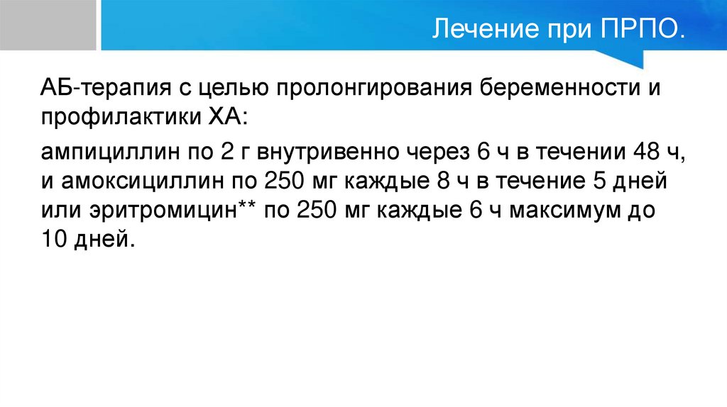 Лечение при ПРПО.АБ-терапия с целью пролонгирования беременности и