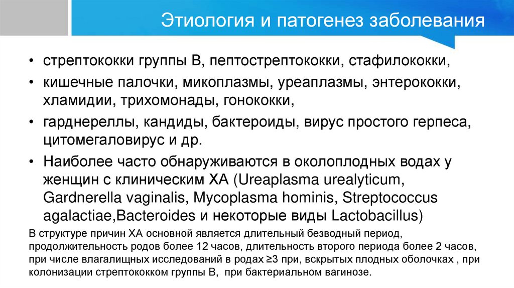 Этиология и патогенез заболевания• стрептококки группы В, пептострептококки, стафилококки,
