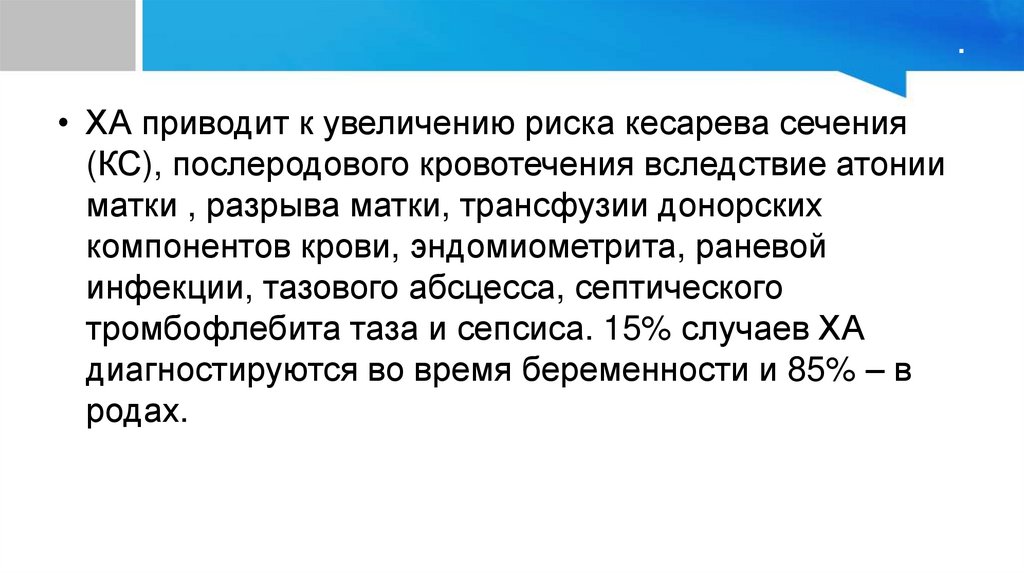 .• ХА приводит к увеличению риска кесарева сечения