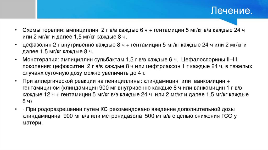 Лечение.• Схемы терапии: ампициллин 2 г в/в каждые 6 ч + гентамицин 5 мг/кг в/в каждые 24 ч