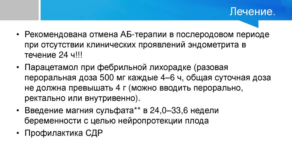 Лечение.• Рекомендована отмена АБ-терапии в послеродовом периоде